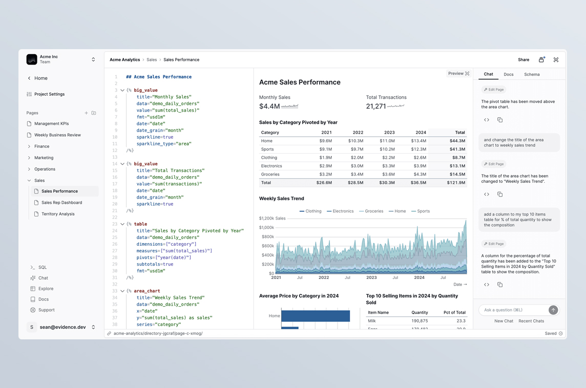 Evidence is a powerful framework for building and publishing data products using SQL, markdown, and AI - things like reports, decision-support tools, and embedded dashboards. It's a code-driven alternative to drag-and-drop business intelligence tools.