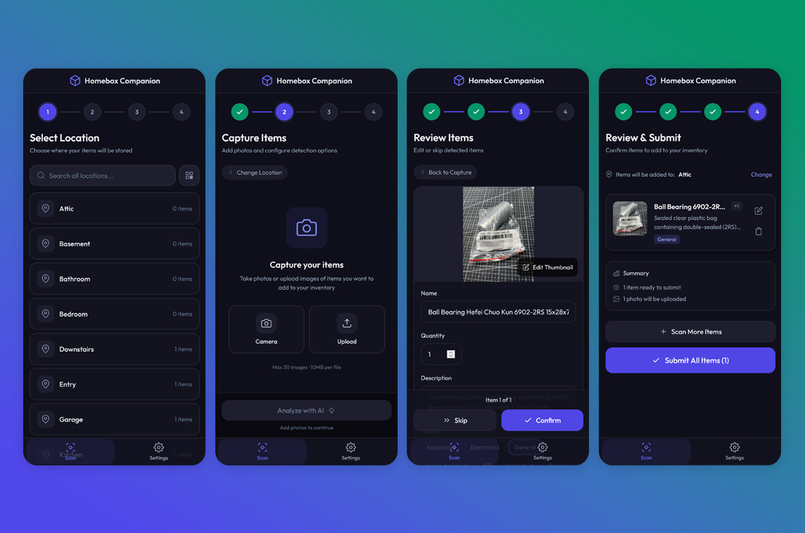 Take a photo of your stuff, and let AI identify and catalog items directly into your Homebox instance. Perfect for quickly inventorying a room, shelf, or collection. Use the AI Chat to manage your inventory, find locations, or update details just by asking.