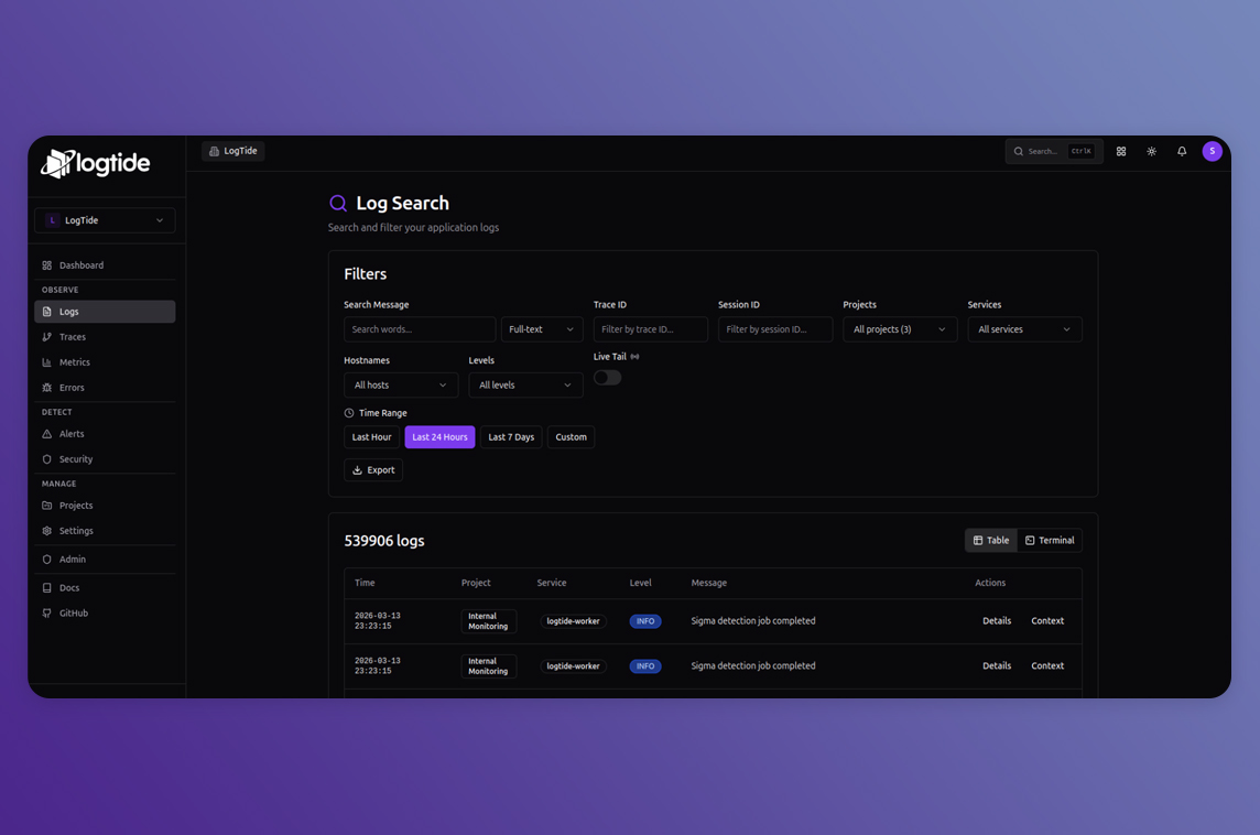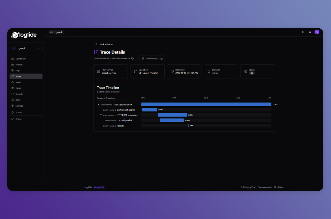 "LogTide is an open-source alternative to Datadog, Splunk, and ELK. Designed for developers and European SMBs who need GDPR compliance, data ownership, and simplicity without the complexity of managing an ElasticSearch cluster.