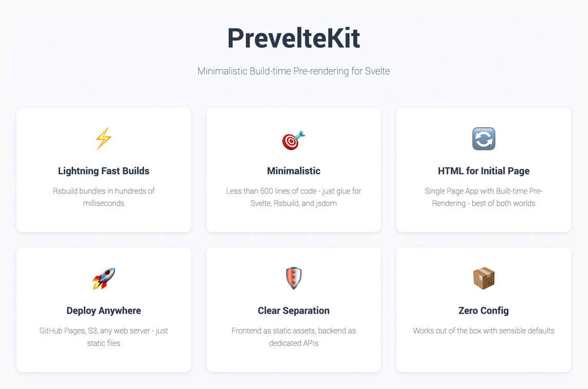 I wanted clean separation like SPAs, but with content already loaded for users. PrevelteKit pre-renders and hydrates Svelte components at build time using jsdom. Frontend infrastructure only serves static files (HTML/CSS/JS). Users immediately see static content, while dynamic content loads separately.