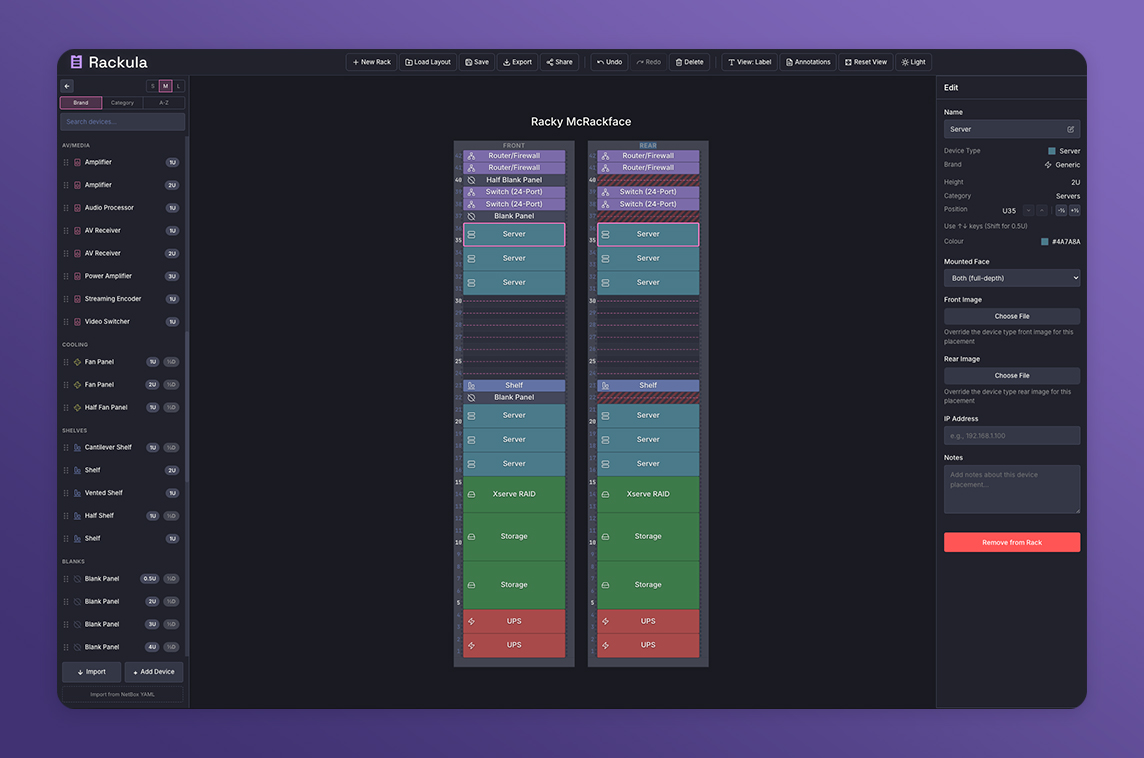 "Rackula is a web app made with Svelte to plan your rack layout. Drag your devices in, move them around, export it. It runs in your browser – you can close the tab whenever you want."