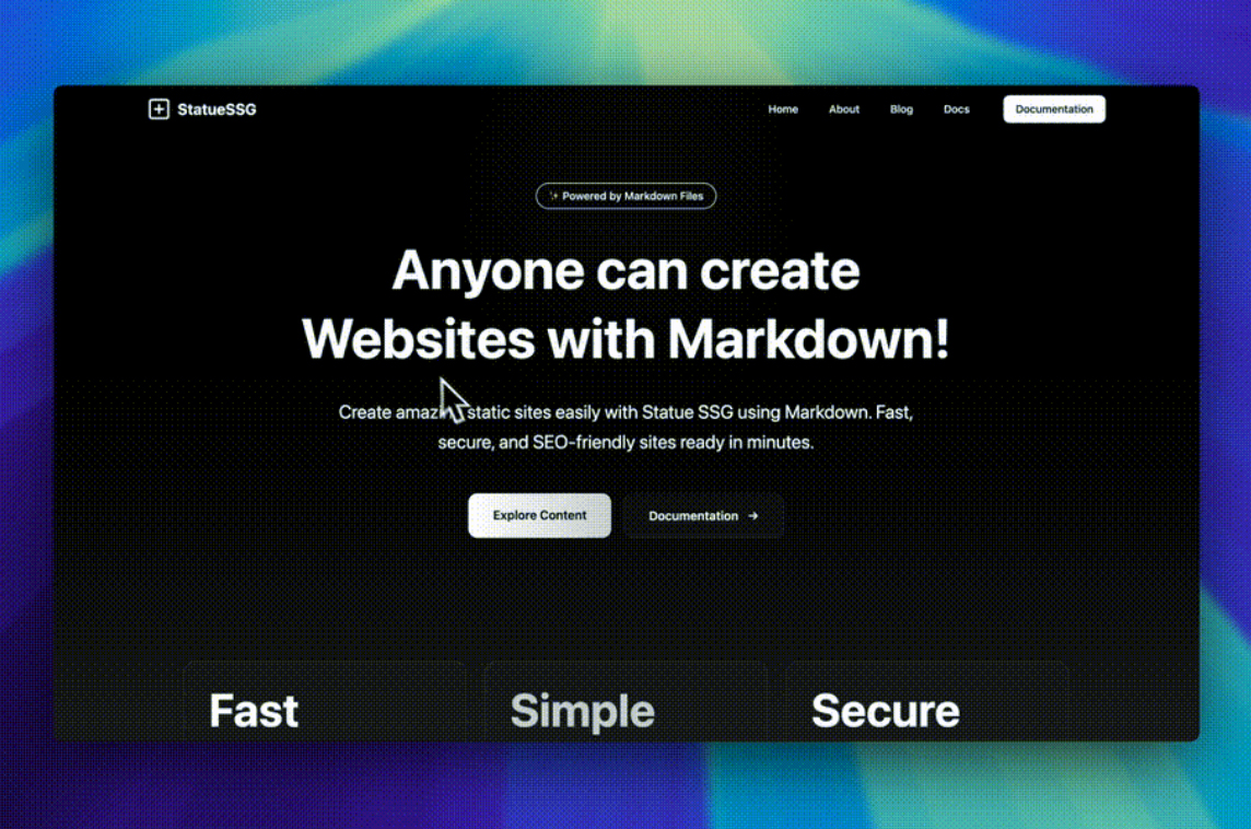 Launch a website for your business, blog, portfolio, or product in seconds: It takes only one command to get started, builds and deployments are fast, hosting is simple, sites are extensible, and developing a Statue site is about building what you want rather than battling, learning, and conforming to the tool itself."