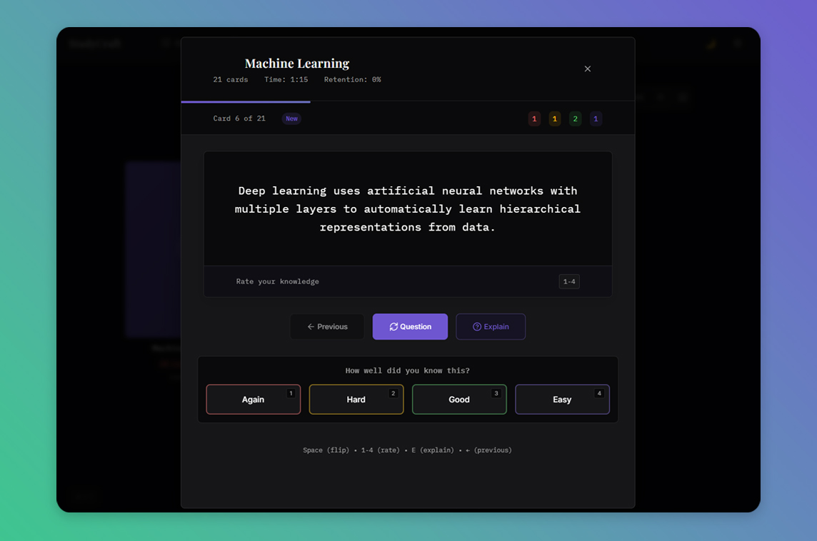 "StudyCraft is a multi-platform desktop application that lets you create study materials from a wide range of sources, edit them as you wish, generate flashcard decks and tests either manually or automatically via LLMs, track your study sessions and customize everything.